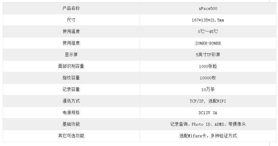 xFace500采用Linux操作系統,具有指紋驗證、人臉識別等多種驗證方式,簽到多種選擇,輕松考勤;中英文輸入法,輕松編寫。標配Wiegand in/out,具有門磁、報警等多種功能,保證工作安全,是您時間管理全新的選擇