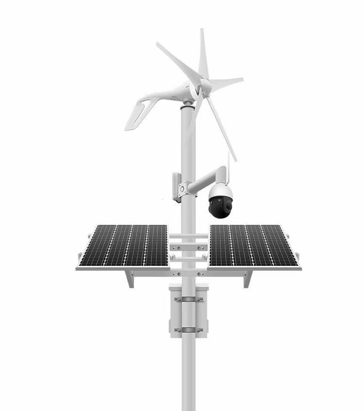 本實用新型提出的一種太陽能風能監控供電系統,有益效果在于:本實用新型在室外無電環境下安裝攝像頭設備,通過太陽能板進行取電,配合懸浮風力發電機進行互補,彌補天氣不好的情況下太陽能板發電的不足的問題,通用球機橫臂支架,兼容市面上球機監控攝像頭,懸浮風力發電機,微風即可啟動適用范圍較廣,L形避雷針解決了安裝風機就不能裝避雷針的問題,通過鎖緊箍連接的支架便于拆裝,方便運輸、及安裝,立桿與箱拖呈四十五度斜撐設計,即保證了電箱的承重,同時懸浮風力發電機、太陽能板和攝像頭的電纜線從桿體內部走線,避免人為破壞,同時也避免了風吹日曬,電箱,開檢修門的設計,方便更好的走線,和后期線路維護,電源箱采用地埋設計,有效防止電池的丟失,大容量的電池不更加容易安裝,整體更加美觀。