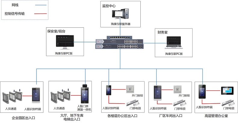 企業園區的人員出入管控主要在一樓及地下車庫的電梯口、各樓層的辦公室入口和其他重要區域,通過部署人臉識別終端和人臉測溫一體機,配合人員通道、門禁電鎖等設備形成人員一臉通管控方案,可實現刷臉和測溫數據實時同步管理軟件,搭配靈活的考勤規則,實現無接觸的門禁管理和考勤管理,助力企業復工中的疫情防控,提升辦公室、園區的智能化程度和人員出入口通行效率,杜絕考勤中的替打卡現象。